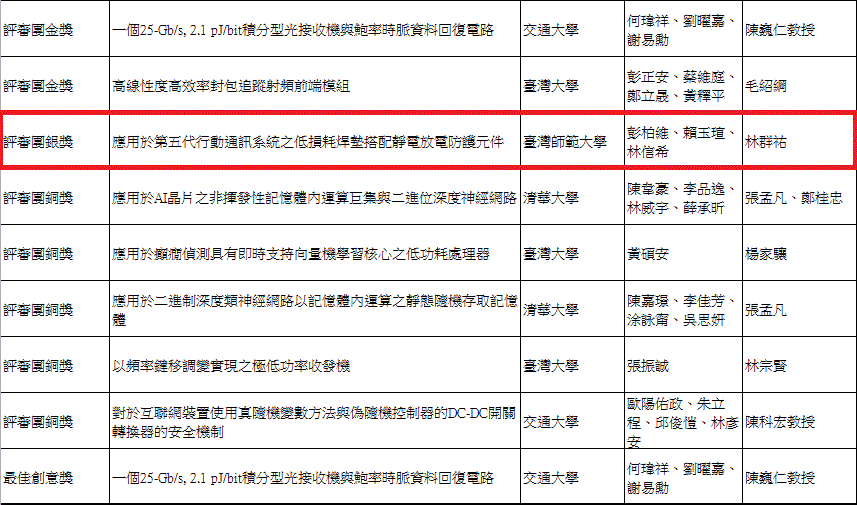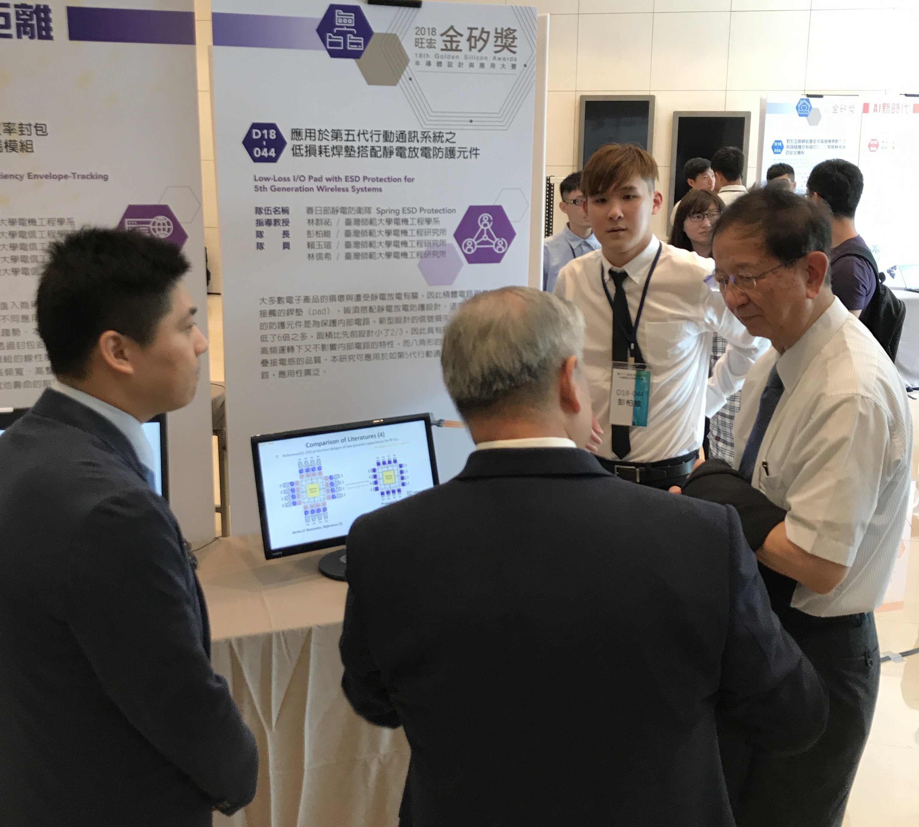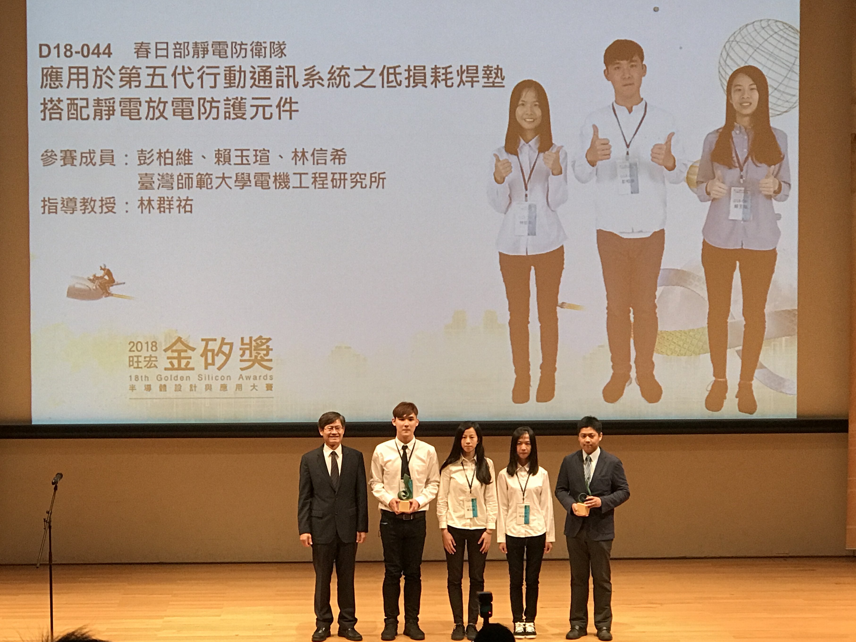 「旺宏金矽獎—半導體設計與應用大賽」今年有45所大專院校、289支隊伍報名、近1000人參與,設計組金獎由台灣大學與交通大學奪得,而台師大電機系林群祐教授所指導之研究團隊 (彭柏維、賴玉瑄、林信希) 獨得設計組銀獎。台師大電機系團隊提出的低損耗焊墊搭配靜電放電防護元件,可應用於第5代行動通訊系統,設計上的創新與獨特性為獲獎的關鍵 。
