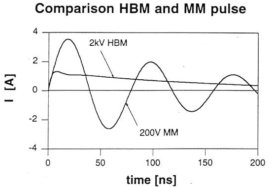 200-V MM的放電電流卻比2-KV HBM的放電電流來得大很